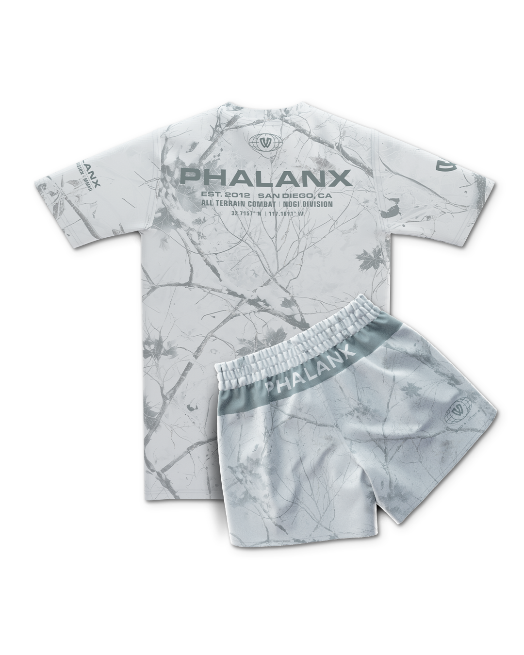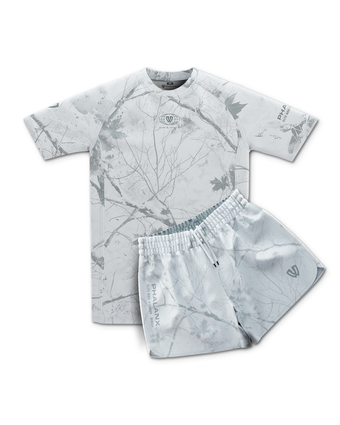 Frostcore was built for the quiet months, when the world goes pale and every movement stands out. A winter-white camo pattern meets Phalanx precision in a durable, lightweight kit made for Jiu Jitsu training and competition. It blends in until it’s time to collide, turning concealment into performance armor