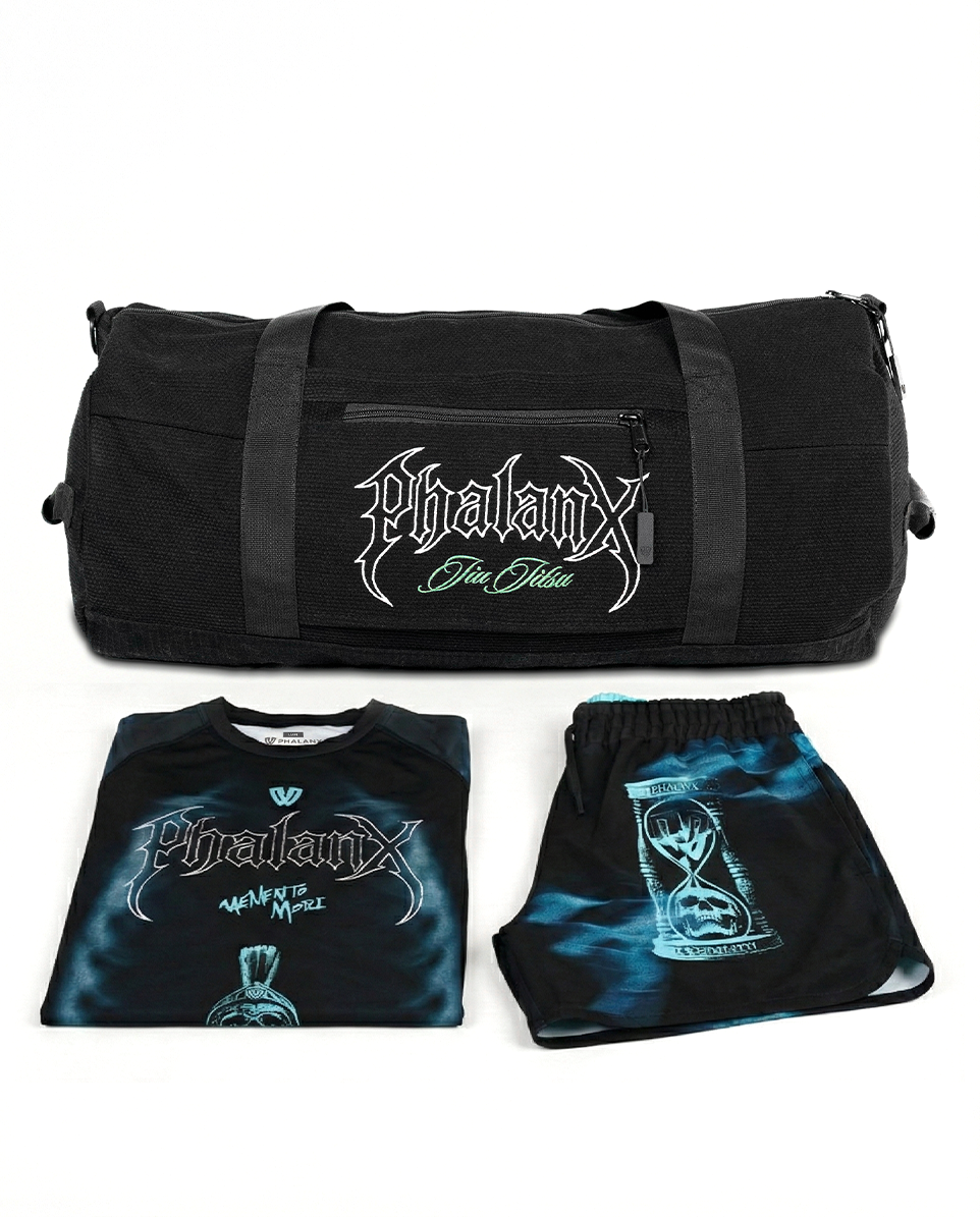 The Memento Mori duffle bag features bold artwork that honors discipline and presence, built for those who train with purpose. Constructed from high quality pearl weave gi material with reinforced carry points and smart storage - no to mention a sturdy rip stop base - it’s made to handle daily gear runs and travel alike.