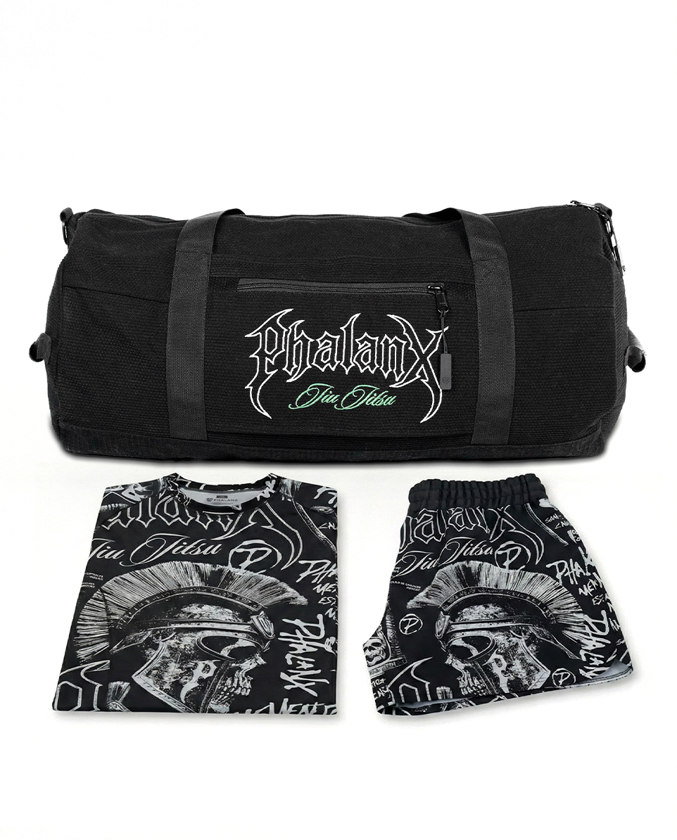 The Memento Mori duffle bag features bold artwork that honors discipline and presence, built for those who train with purpose. Constructed from high quality pearl weave gi material with reinforced carry points and smart storage - no to mention a sturdy rip stop base - it’s made to handle daily gear runs and travel alike.