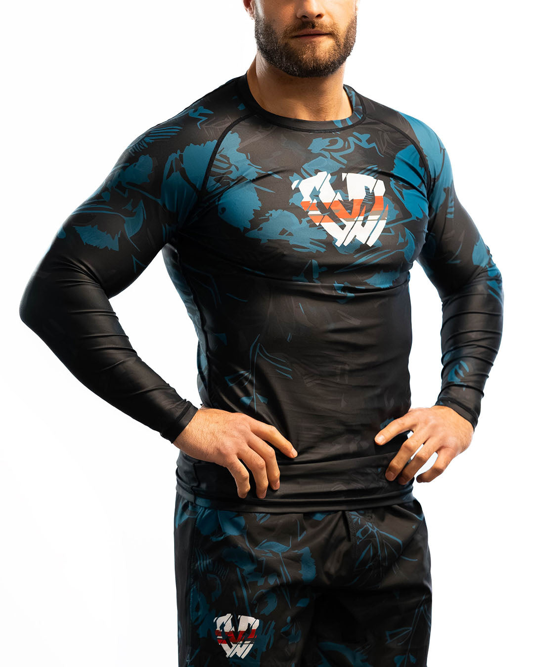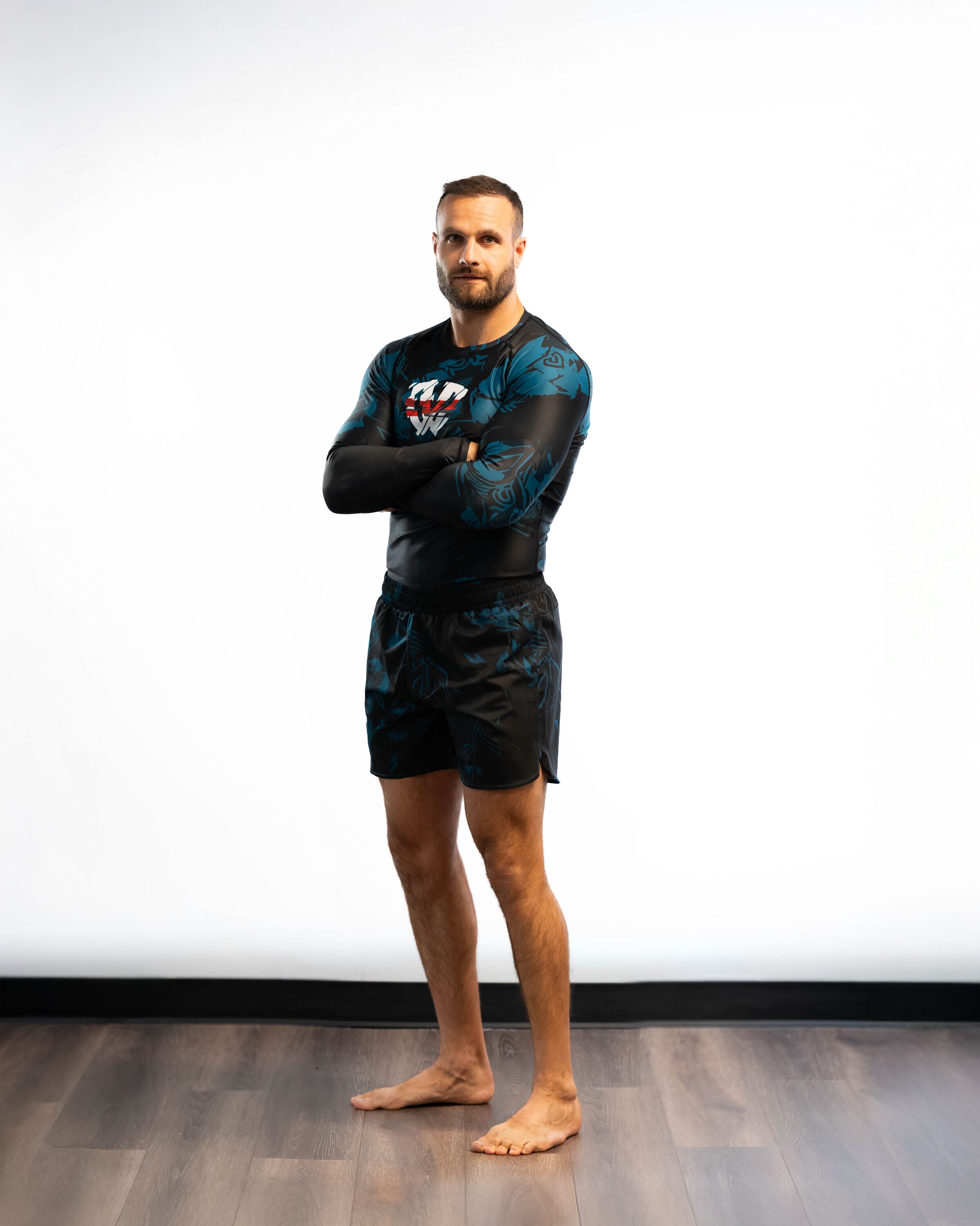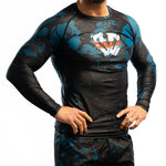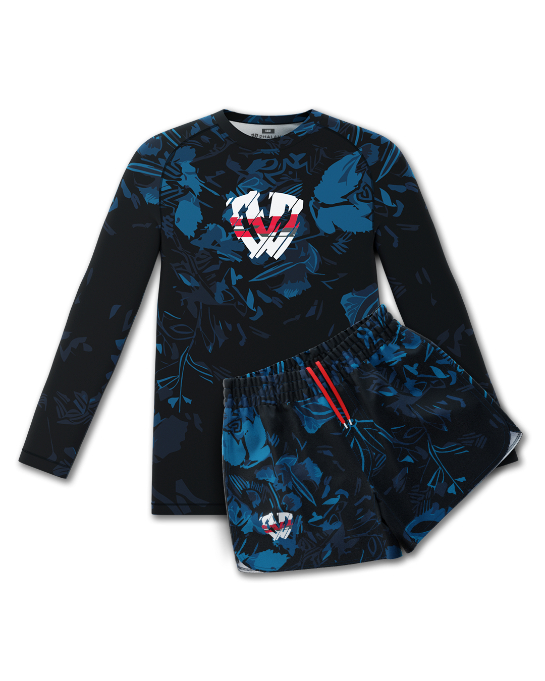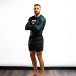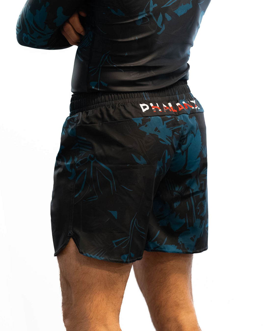 The Mando kit combines black with deep aqua accents and a stylized Phalanx logo, built for men who train and compete. Durable stretch, moisture-wicking fabric, and fade-proof graphics keep it strong through every roll, delivering true armor for the mats.