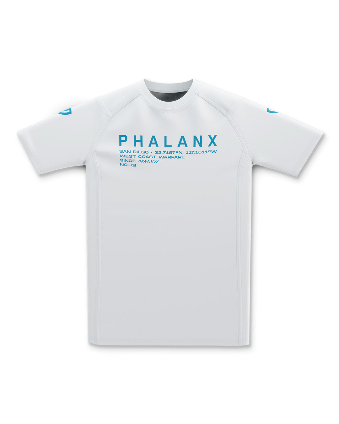 The West Coast Warfare rash guard in white with clean blue detailing reflects Phalanx heritage and presence. Built for men who train and compete, it delivers durable stretch, moisture wicking comfort, and fade proof graphics, giving you disciplined armor for every roll on the mats.