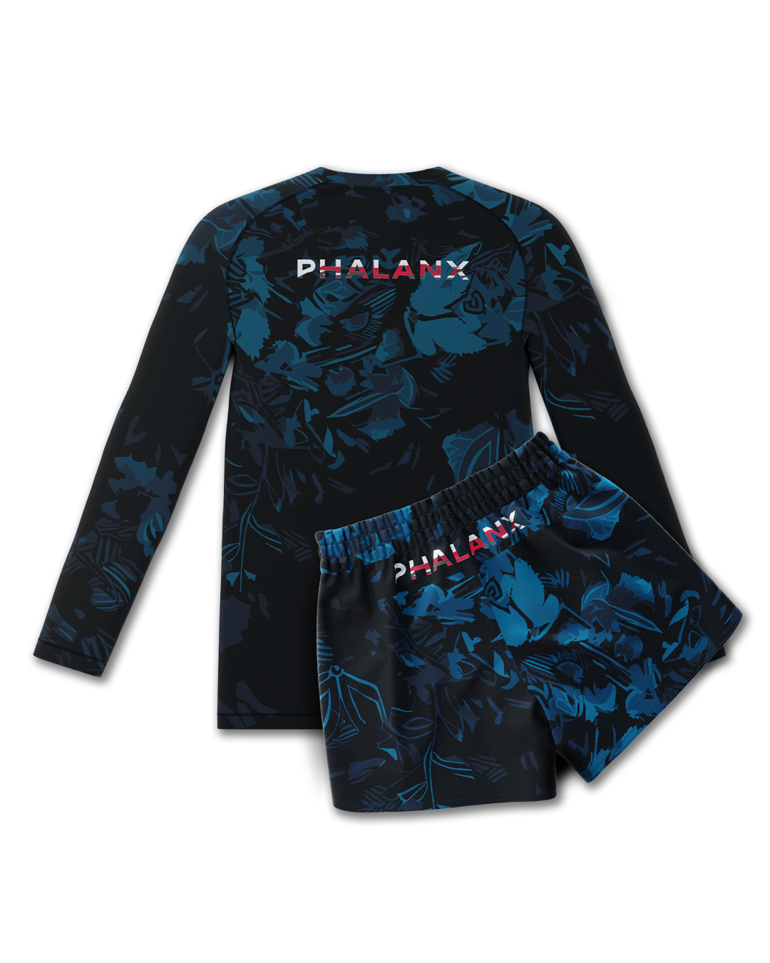 The Mando kit combines black with deep aqua accents and a stylized Phalanx logo, built for men who train and compete. Durable stretch, moisture-wicking fabric, and fade-proof graphics keep it strong through every roll, delivering true armor for the mats.