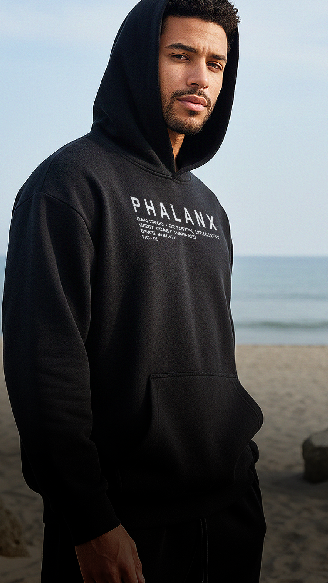 The oversized fit, drop-shoulder cut, and roomy hood bring a modern edge, while the bold West Coast Warfare print makes it unmistakably Phalanx. Finished with a front kangaroo pocket for utility and ribbed cuffs and hem for a secure fit, this is the hoodie you’ll reach for before and after every session.
