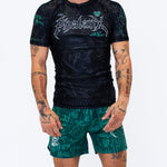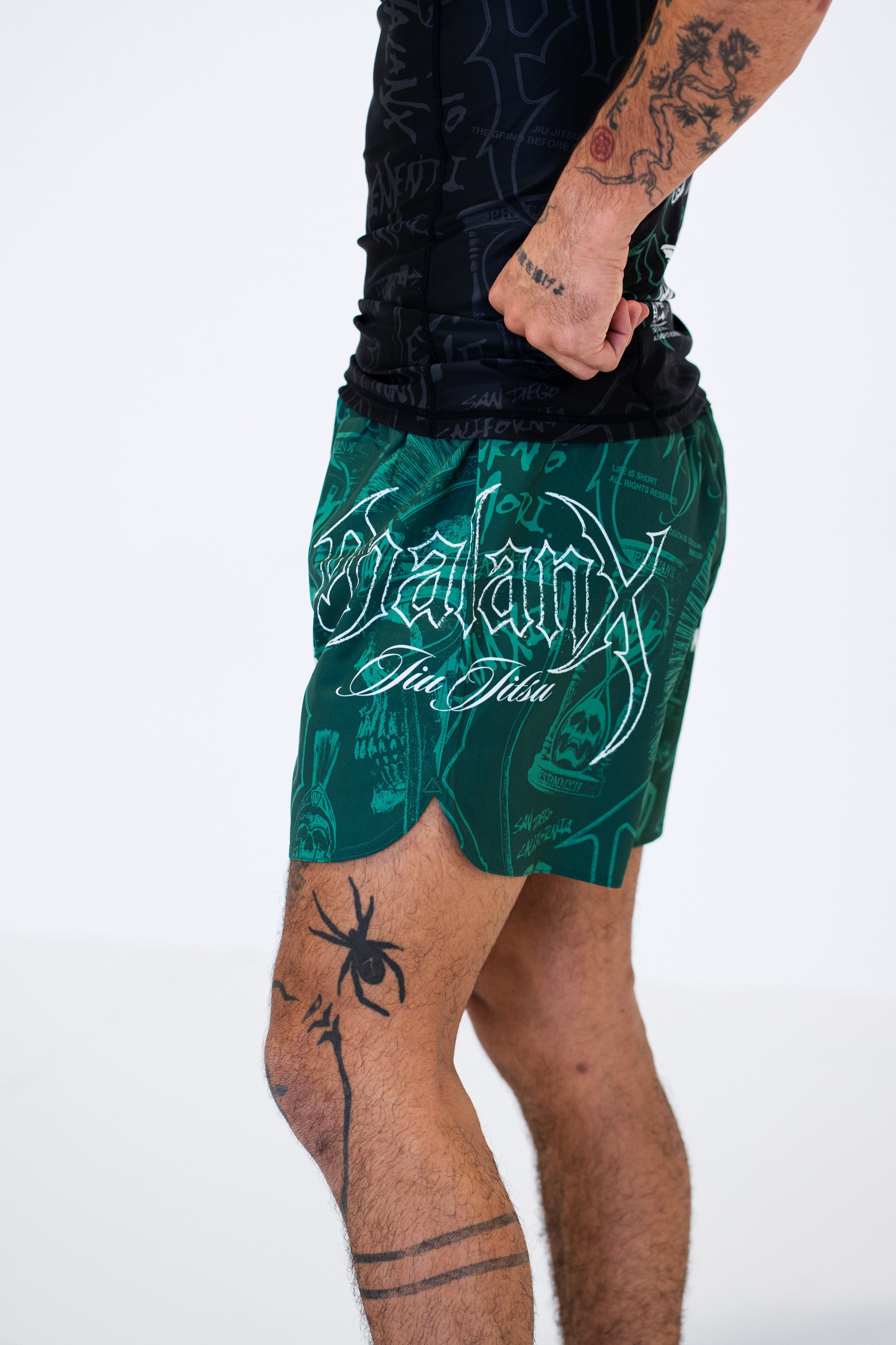 The Memento Mori Wraith fight shorts showcase bold artwork in a striking green design, built for those who train and compete. Lightweight and fast drying with 4 way stretch and a secure waistband, they deliver durable armor that endures every roll on the mats.